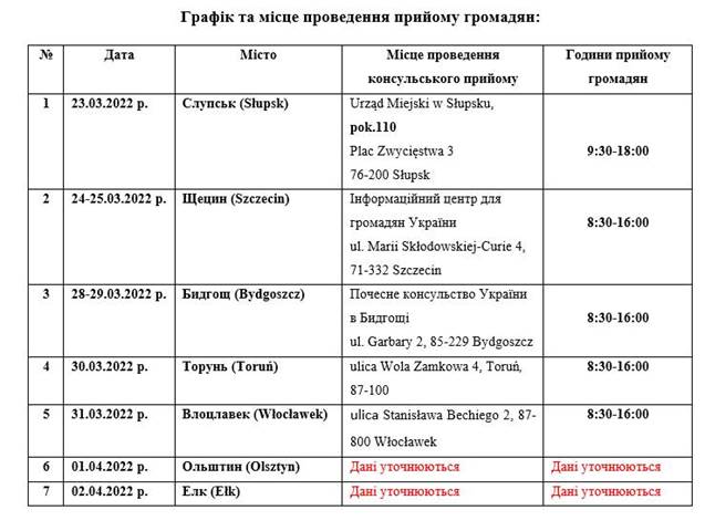 Konsulat Ukrainy w Gdańsku inicjuje wyjazdowe usługi konsularne dla obywateli Ukrainy w województwach: pomorskim, zachodniopomorskim, kujawsko-pomorskim i warmińsko-mazurskim.