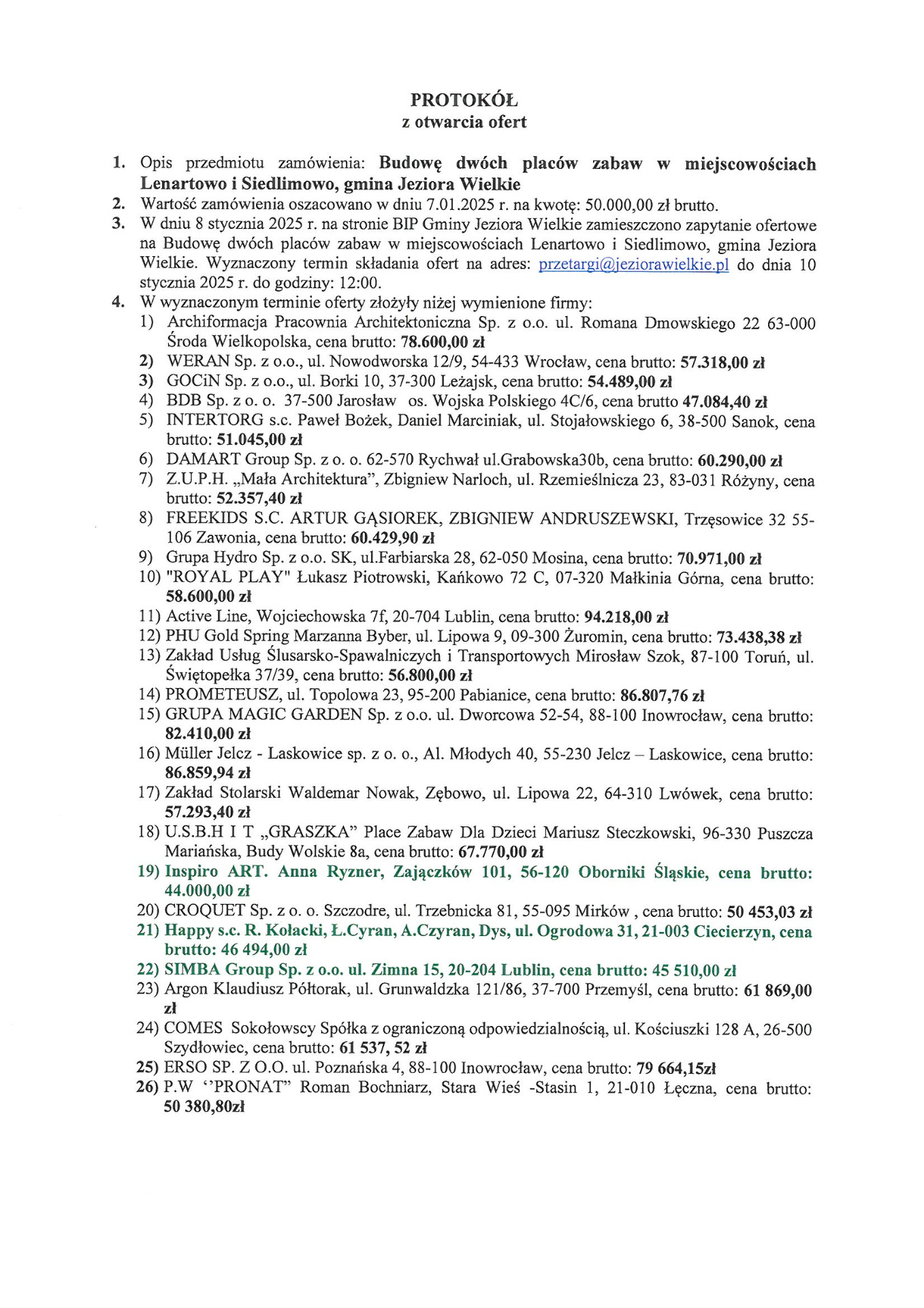 1. W wyniku negocjacji cenowych oferenci w wyznaczonym przez Zamawiającego terminie tj. do dnia 13 stycznia 2025 r. do godz. 12:00 na adres: przetargi@jeziorawielkie.pl przedłożyli ostateczne oferty:
